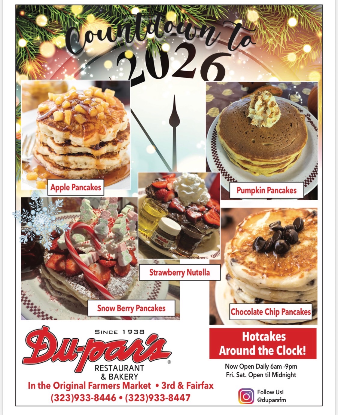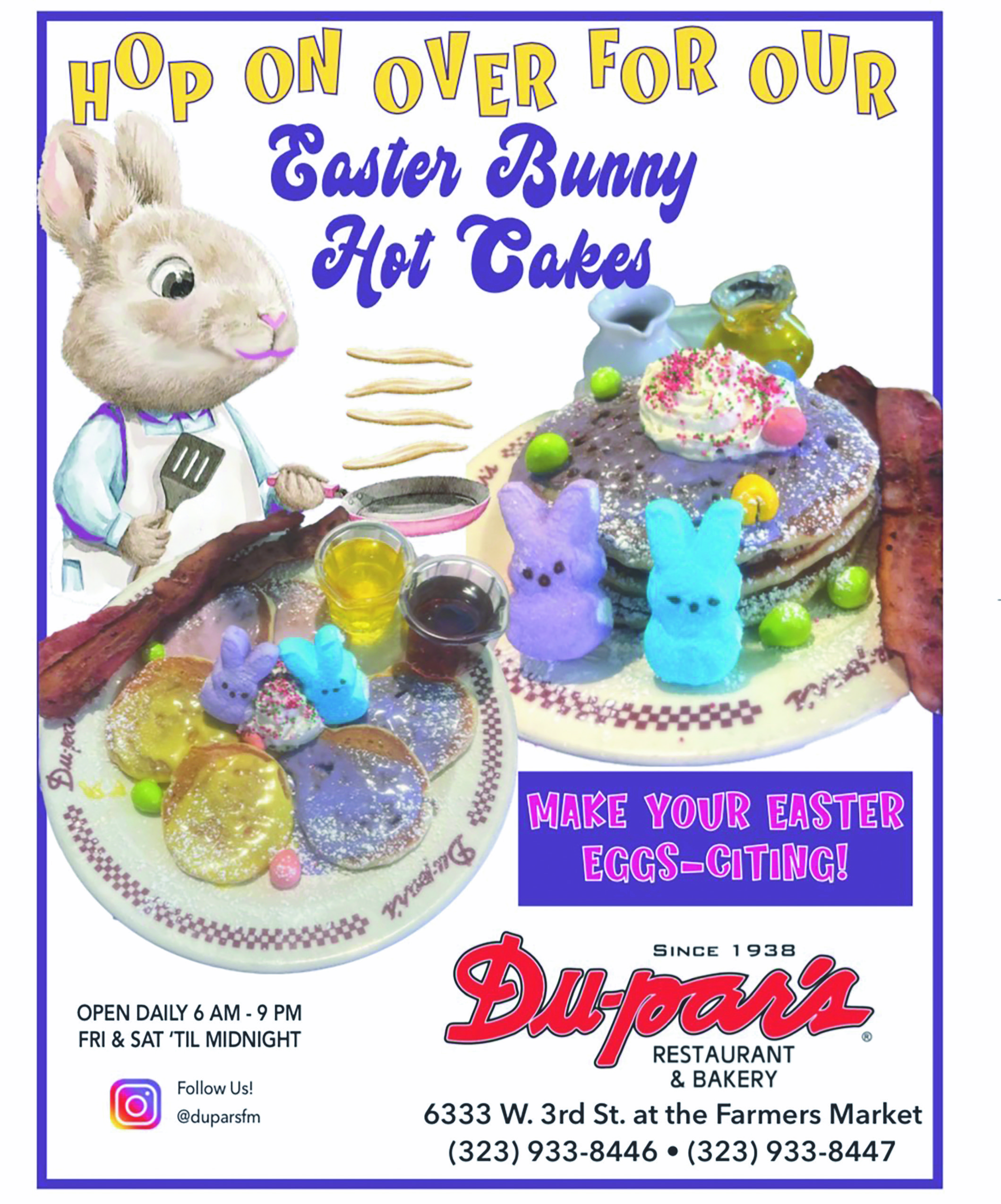 Our quality meats, fresh vegetables and fruits, and pies and pastries are all prepared, by hand, fresh daily. Since Du-par’s Restaurant and Bakery first opened at Farmer’s Market in 1938, generations have enjoyed our fare. Indeed, our Du-par’s hotcakes have now become famous.