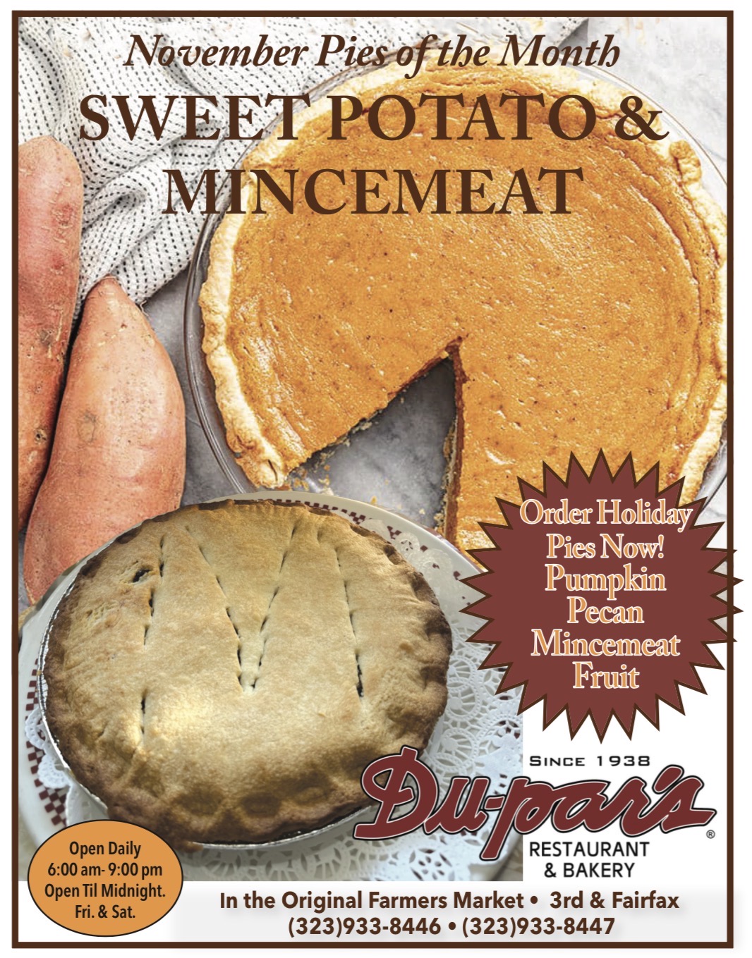 Our quality meats, fresh vegetables and fruits, and pies and pastries are all prepared, by hand, fresh daily. Since Du-par’s Restaurant and Bakery first opened at Farmer’s Market in 1938, generations have enjoyed our fare. Indeed, our Du-par’s hotcakes have now become famous.